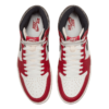 Este tênis Nike Air Jordan 1 apresenta uma base de lona branca com sobreposições vermelhas, swooshes de couro preto.